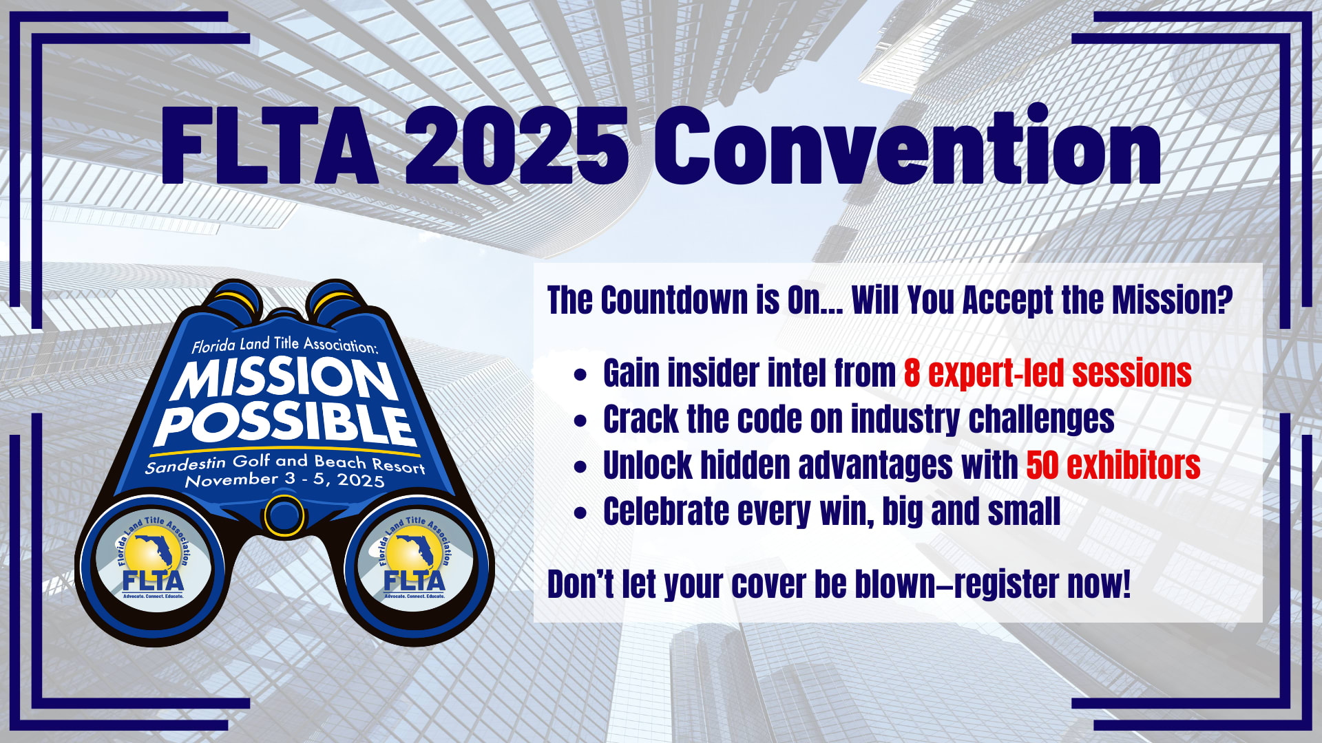 This November, join us for: Mission Possible! We are eager to welcome you to Miramar Beach, FL for the annual FLTA convention. This year we will be focused on business education, networking, and continued member engagement. Will you be joining us? Hoping you will say "yes", please click on the "registration button" to secure your seat.