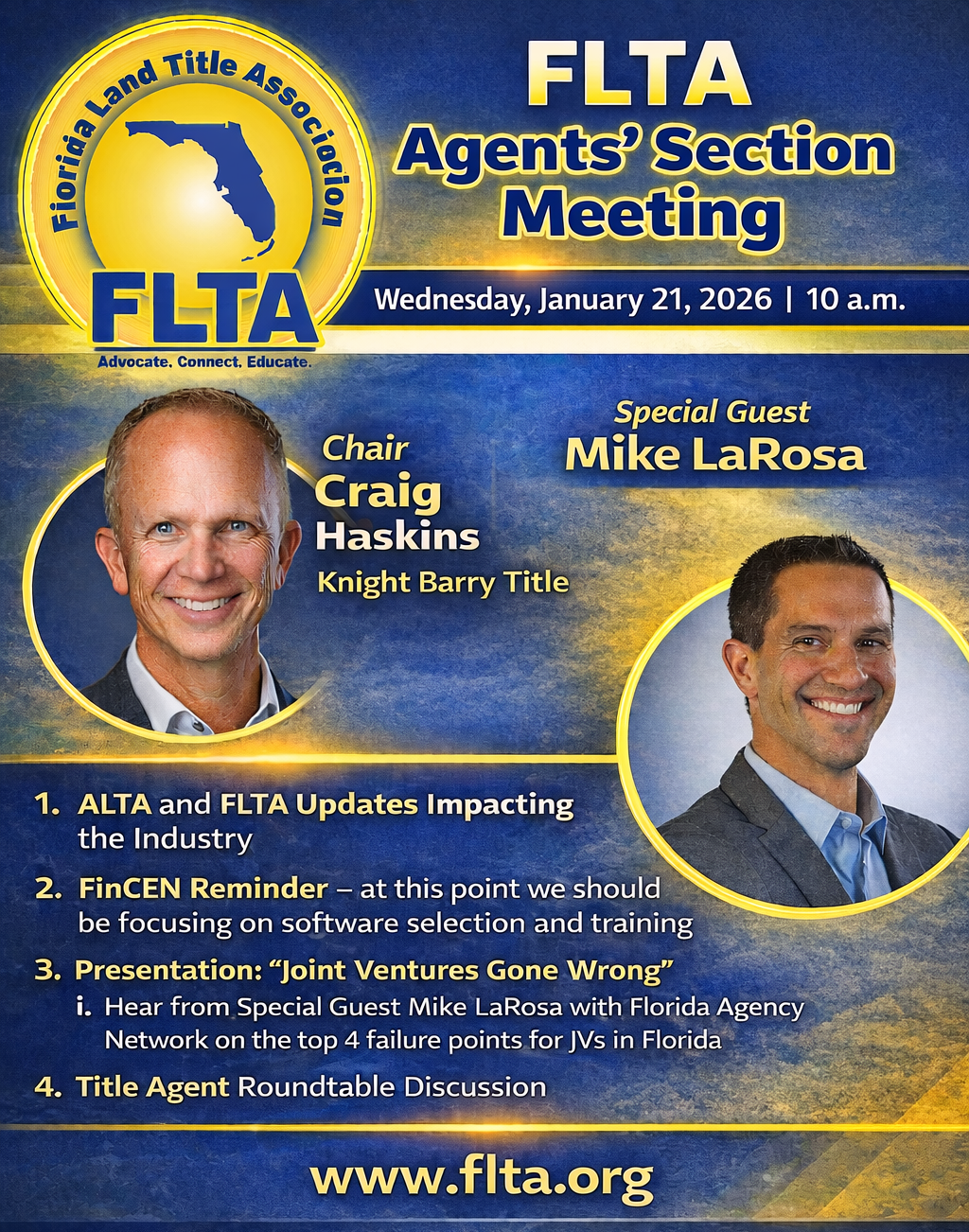 The Agents' Section is comprised of representatives from Florida Licensed Title Agencies and Law Firms who are members of the Florida Land Title Association. This month we open the meeting for an "Open House" as we kickoff 2026.